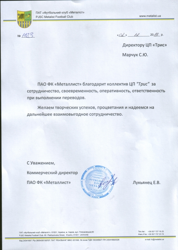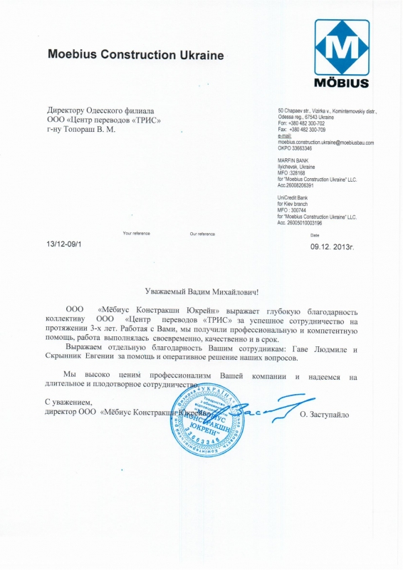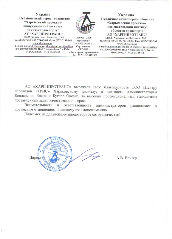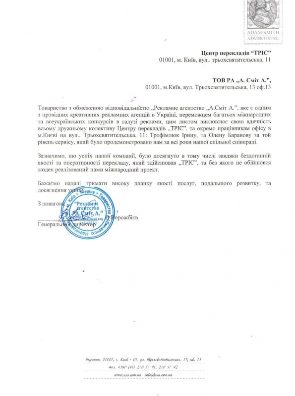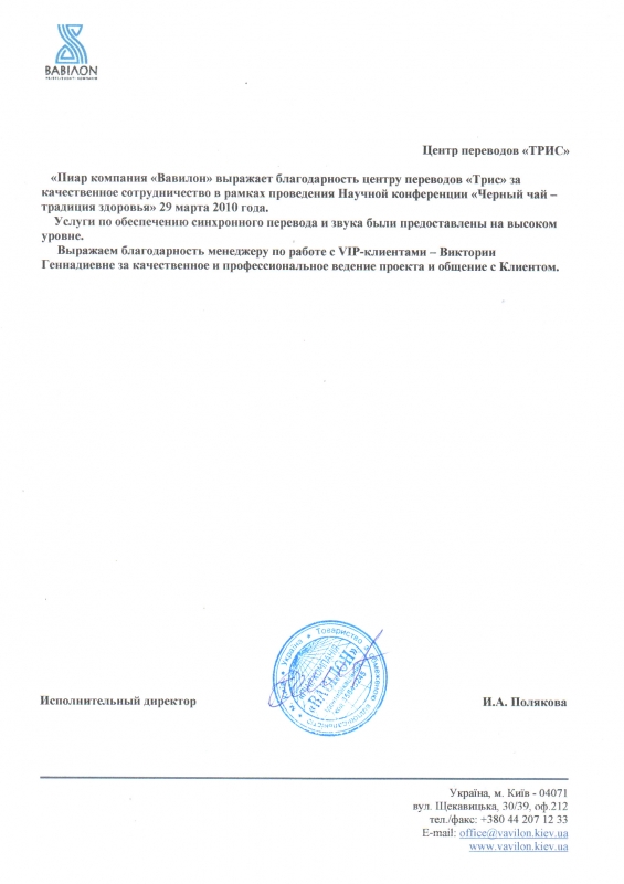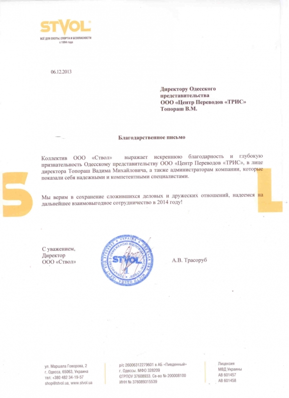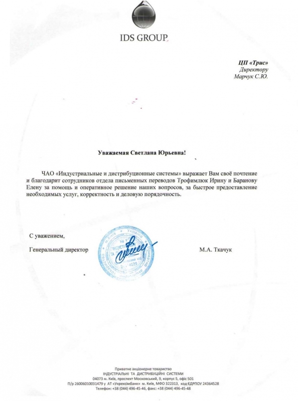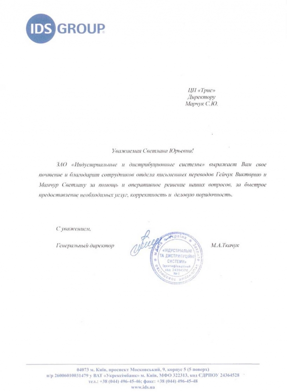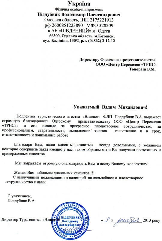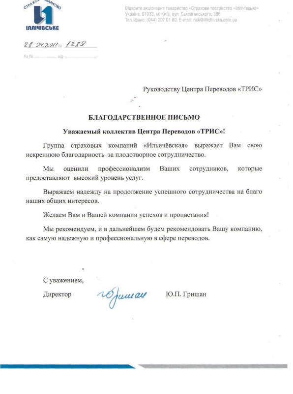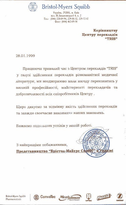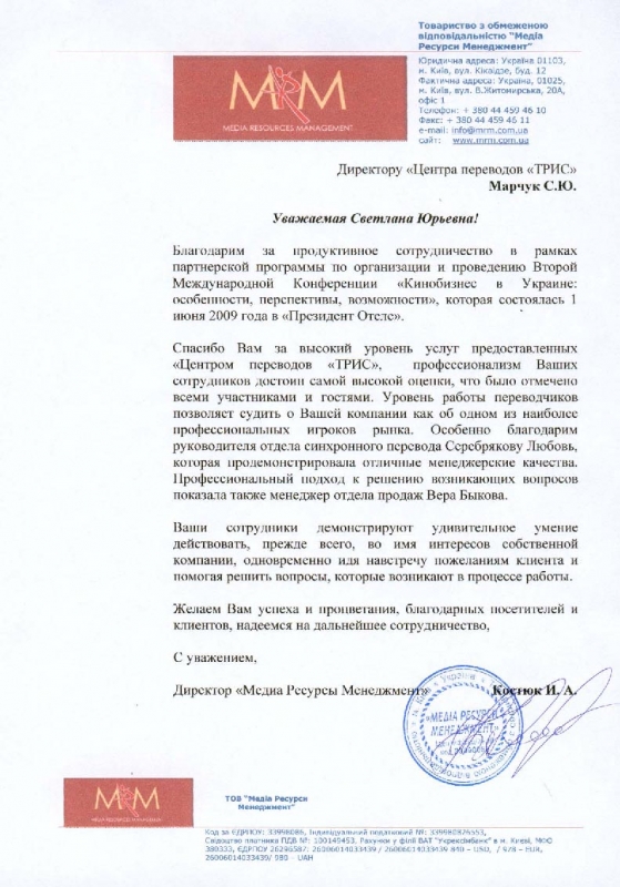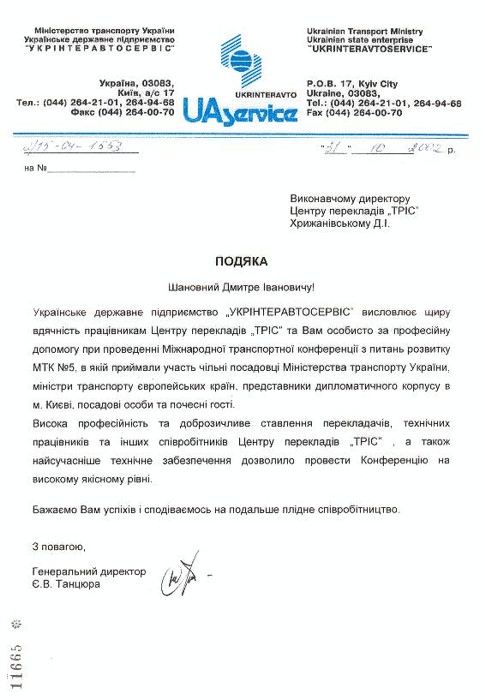 Список благодарностей бюро переводов «Трис» от наших клиентов. Мы по праву гордимся сотрудничеством с известными украинскими и международными компаниями. Каждый экземпляр закреплён мокрой печатью организации и хранится в главном офисе.