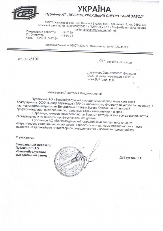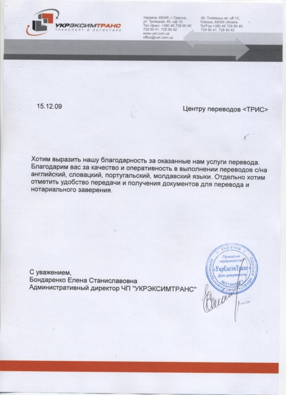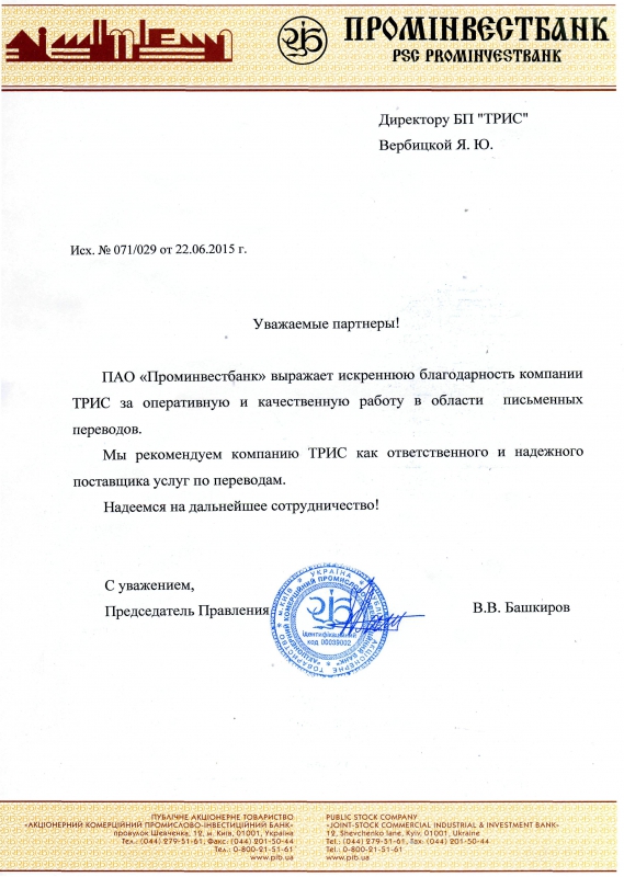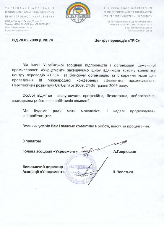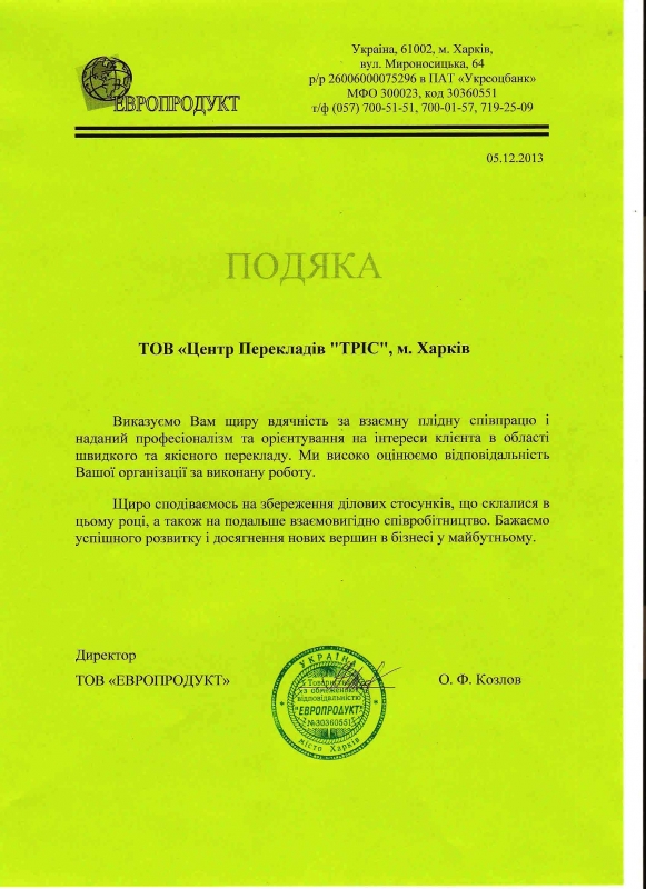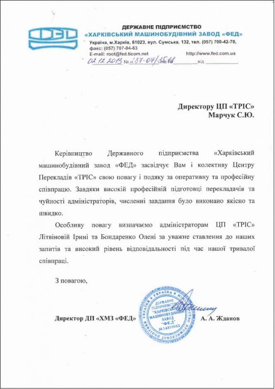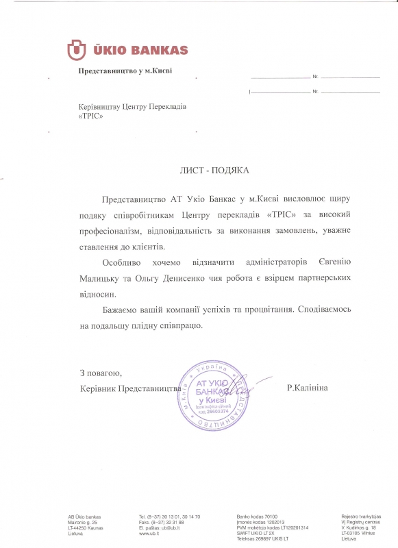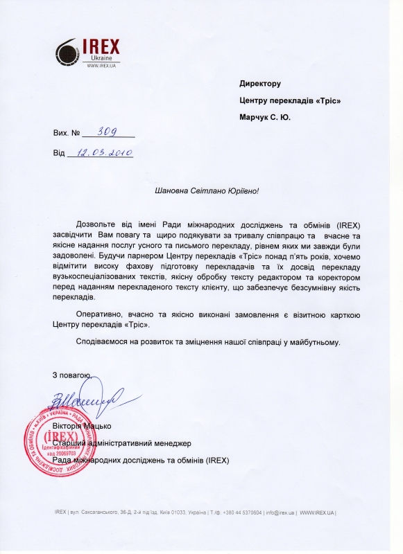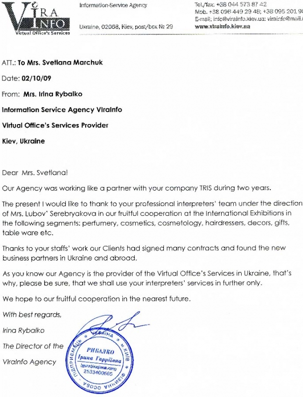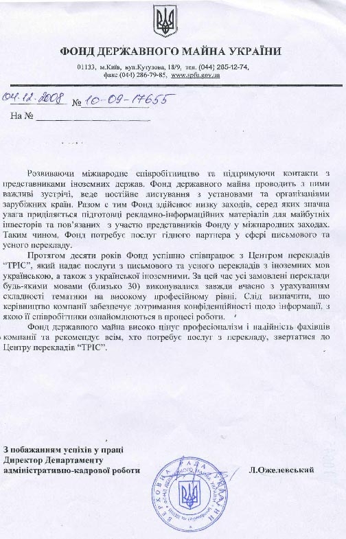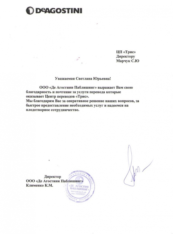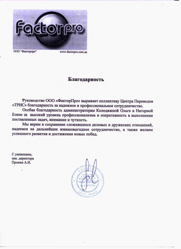 Список благодарностей бюро переводов «Трис» от наших клиентов. Мы по праву гордимся сотрудничеством с известными украинскими и международными компаниями. Каждый экземпляр закреплён мокрой печатью организации и хранится в главном офисе.