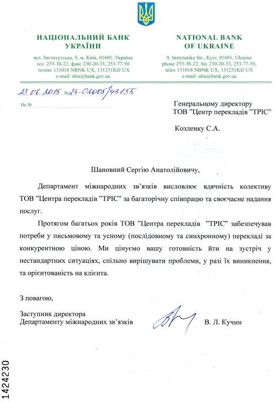 Отличная новость! Наш центр переводов "Трис" выиграл тендер на обслуживание Нацбанка в 2014 году!