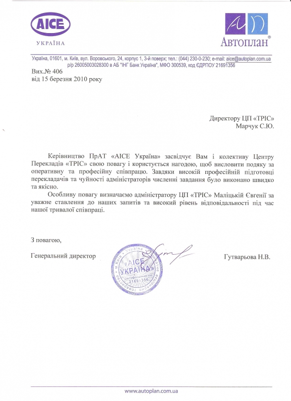 Список благодарностей бюро переводов «Трис» от наших клиентов. Мы по праву гордимся сотрудничеством с известными украинскими и международными компаниями. Каждый экземпляр закреплён мокрой печатью организации и хранится в главном офисе.